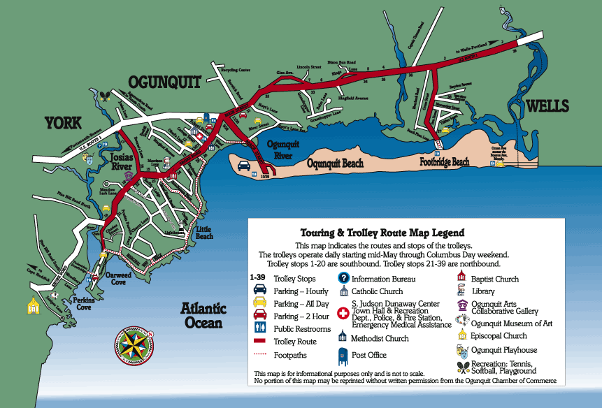 On the Trolley, you can relax and enjoy the breathtaking sights that Ogunquit has to offer. Enjoy the Marginal Way, a mile and a half long foot path that follows the shoreline south of the center of the village This walk is spectacular! And at the end of the Marginal Way is Perkins Cove, a quaint little harbor, that has been home to artists around the world nearly 100 years.